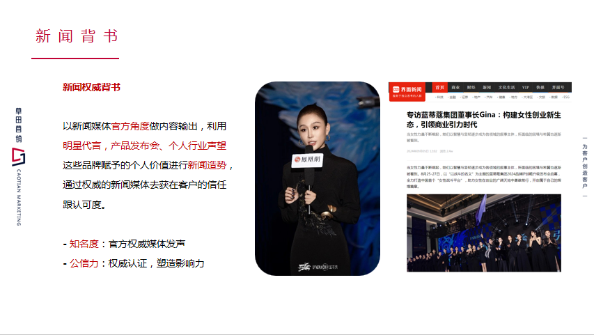 新闻权威背书,以新闻媒体官方角度做内容输出,利用明星代言,产品发布会、个人行业声望这些品牌赋予的个人价值进行新闻造势,通过权威的新闻媒体去获在客户的信任跟认可度。