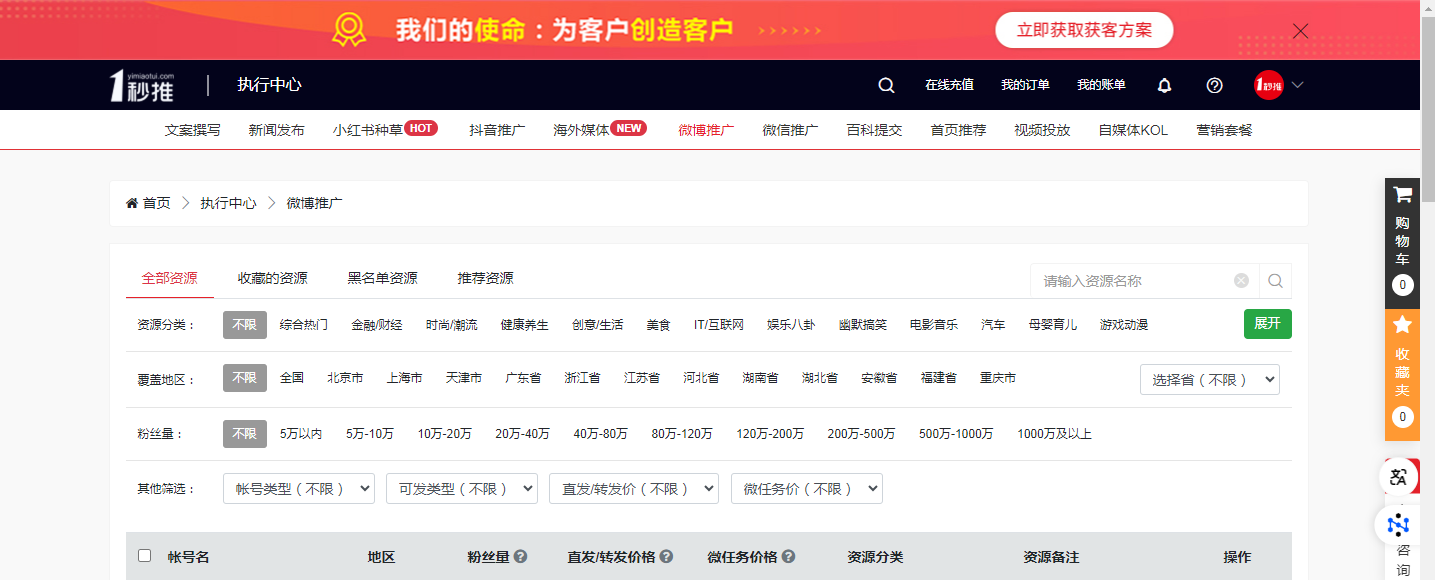 3、登录后,进入“海量媒体资源”。在媒体渠道中,选择“微博推广”按钮以进入。